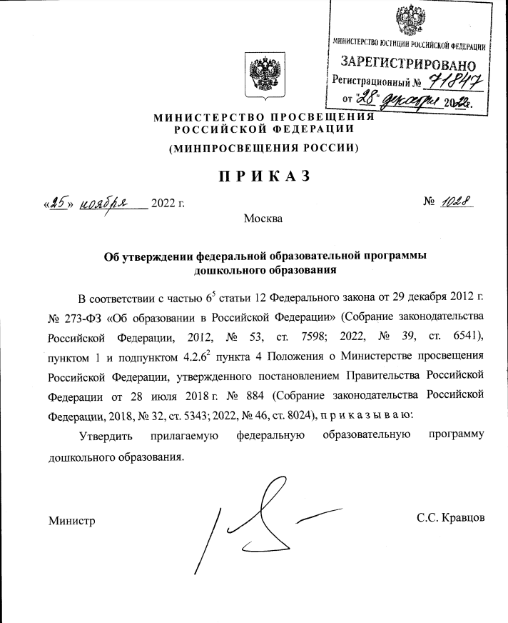 Приказ Министерства просвещения Росийской Федерации № 1028 от 25.11.2022 «Об утверждении федеральной образовательной программы дошкольного образования».